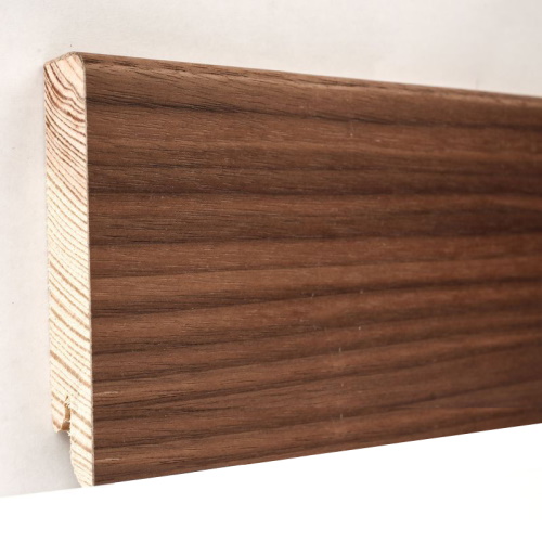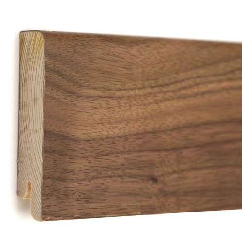 Горіх американський (шпон натурального горіха) декор цього плінтуса підкреслить контури приміщення і додасть завершений і дорогий вид! Горіх – дуже строкатий, його малюнок неповторний і яскраво виділяється серед всіх інших шпонованих плінтусів.